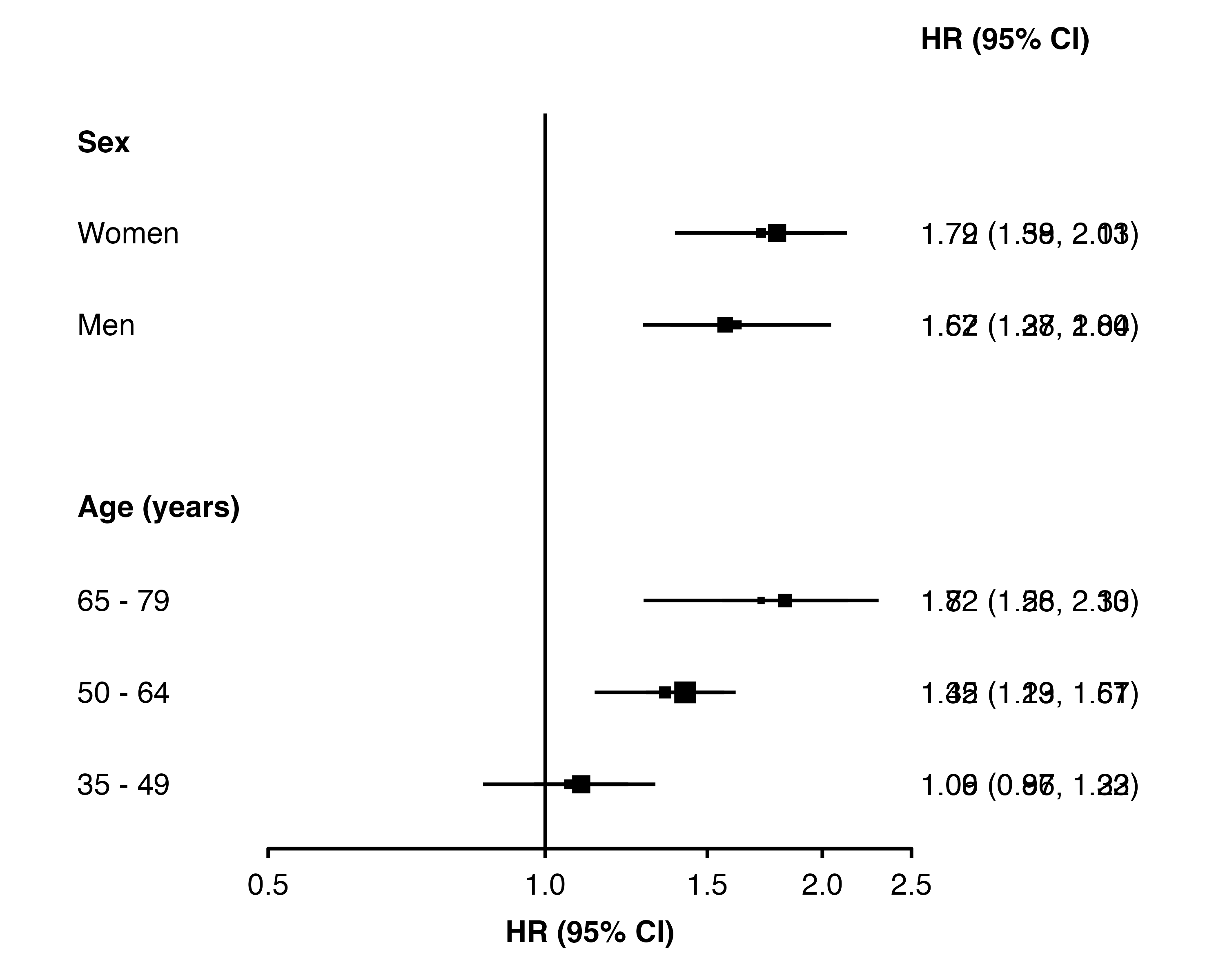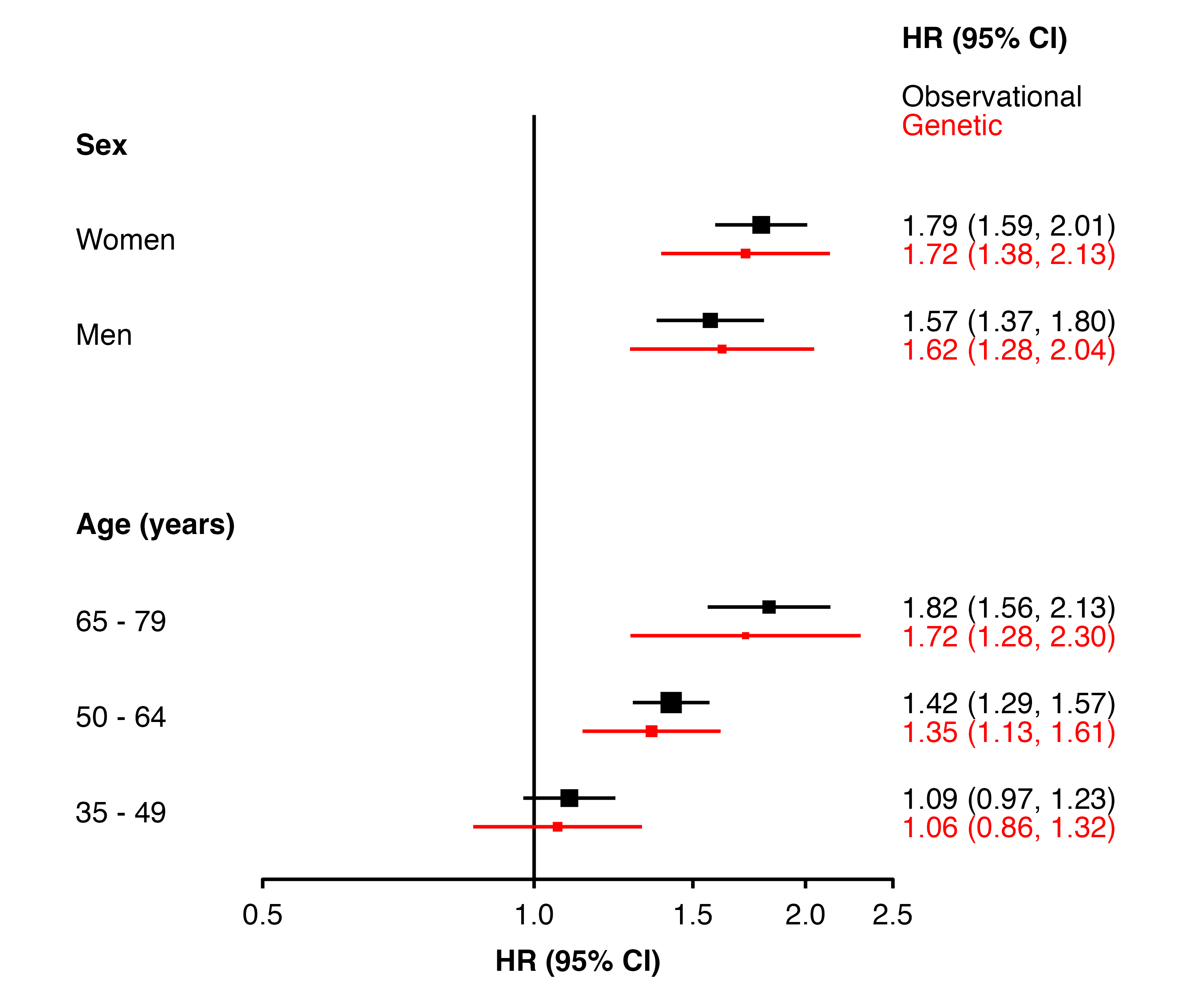 # create 'mycolour' column, according to analysis typemy_resultsAB <- dplyr::mutate(my_resultsAB,mycolour = dplyr::if_else(analysis =="Observational","black","red"))# function to decrease/increase 'row' for Observational/Geneticmove_rows <-function(datatoplot){ datatoplot <- dplyr::mutate(datatoplot,row = dplyr::if_else(analysis =="Observational", row -0.15, row +0.15))## add rows to the data frame to create annotations datatoplot <- dplyr::add_row(datatoplot,auto_estcolumn =c("Observational","Genetic"),row =c(0.5, 0.8),panel ="1",mycolour =c("black", "red"))return(datatoplot)}# add the col.keep, colour, data.function, and addaes argumentsforest_plot(my_resultsAB,col.key ="subgroup",row.labels = row_labels,scalepoints =TRUE,col.keep ="analysis",colour ="mycolour",data.function ="move_rows",addaes =list(col.right ="colour = mycolour"))