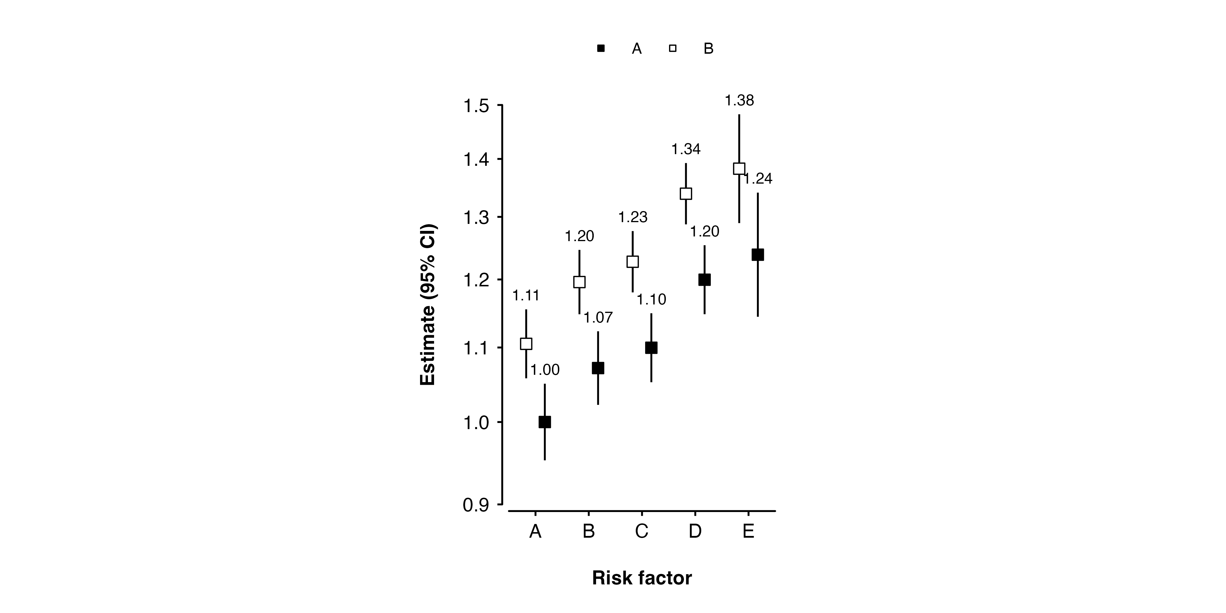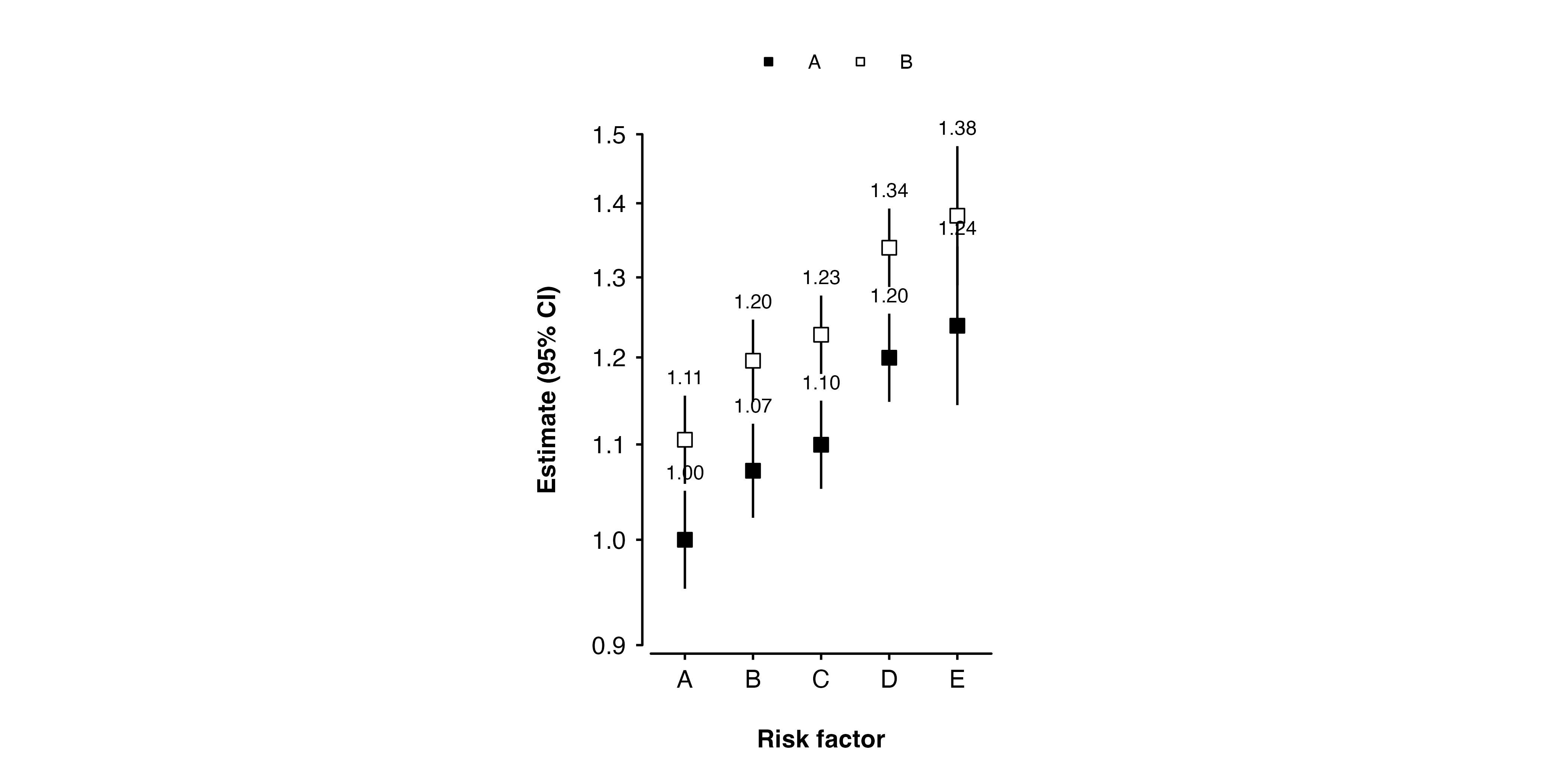 This example adds the same position argument to estimates.points, ci, and estimates.text, using position_dodge() to move them all to the left or right.